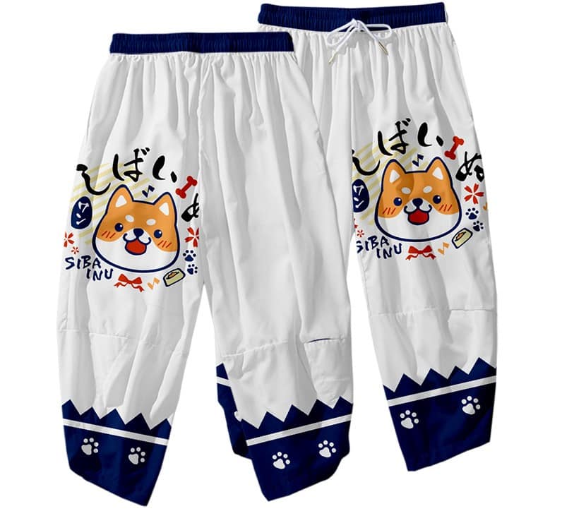 Fede haori harembukser i hvid, med et kawaii shiba inu motiv. Autentisk design der gør haori-looket komplet. Åndbart og behageligt materiale i ren polyester. Bukserne har en elastisk kant der vil passe de fleste kropsformer.