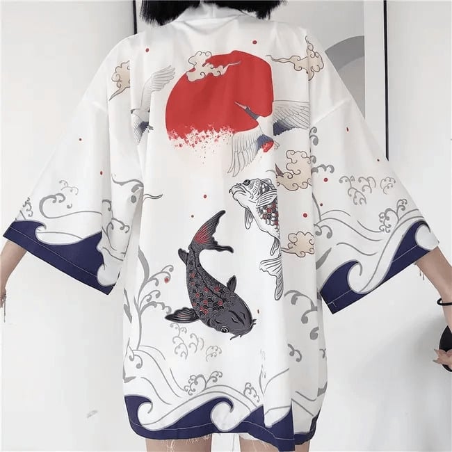 Smuk og moderne japansk Yukata i lårkort længde. Yukataen er designet med det flotteste traditionelle Hokusai-inspirerede Koi Karpe motiv og udført med de ikoniske brede ærmer. Quick Dry teknologi i åndbart polyester.